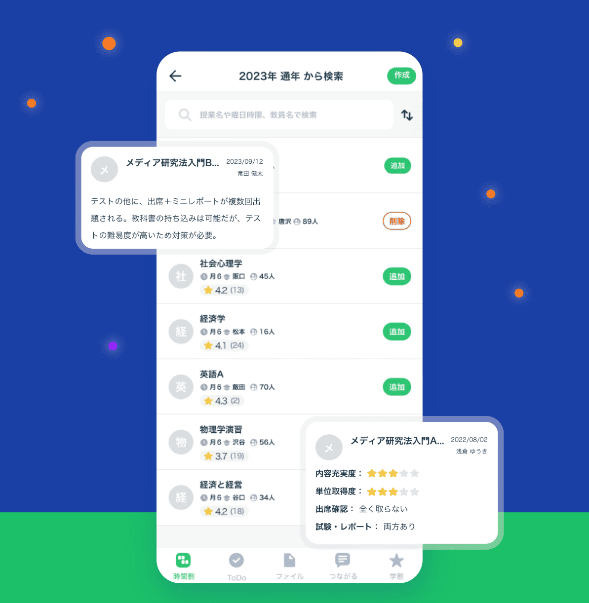 は、大学生向けの時間割アプリでして、アプリ内で時間割を作れたり、授業の口コミをチェックできたりするんですよね。